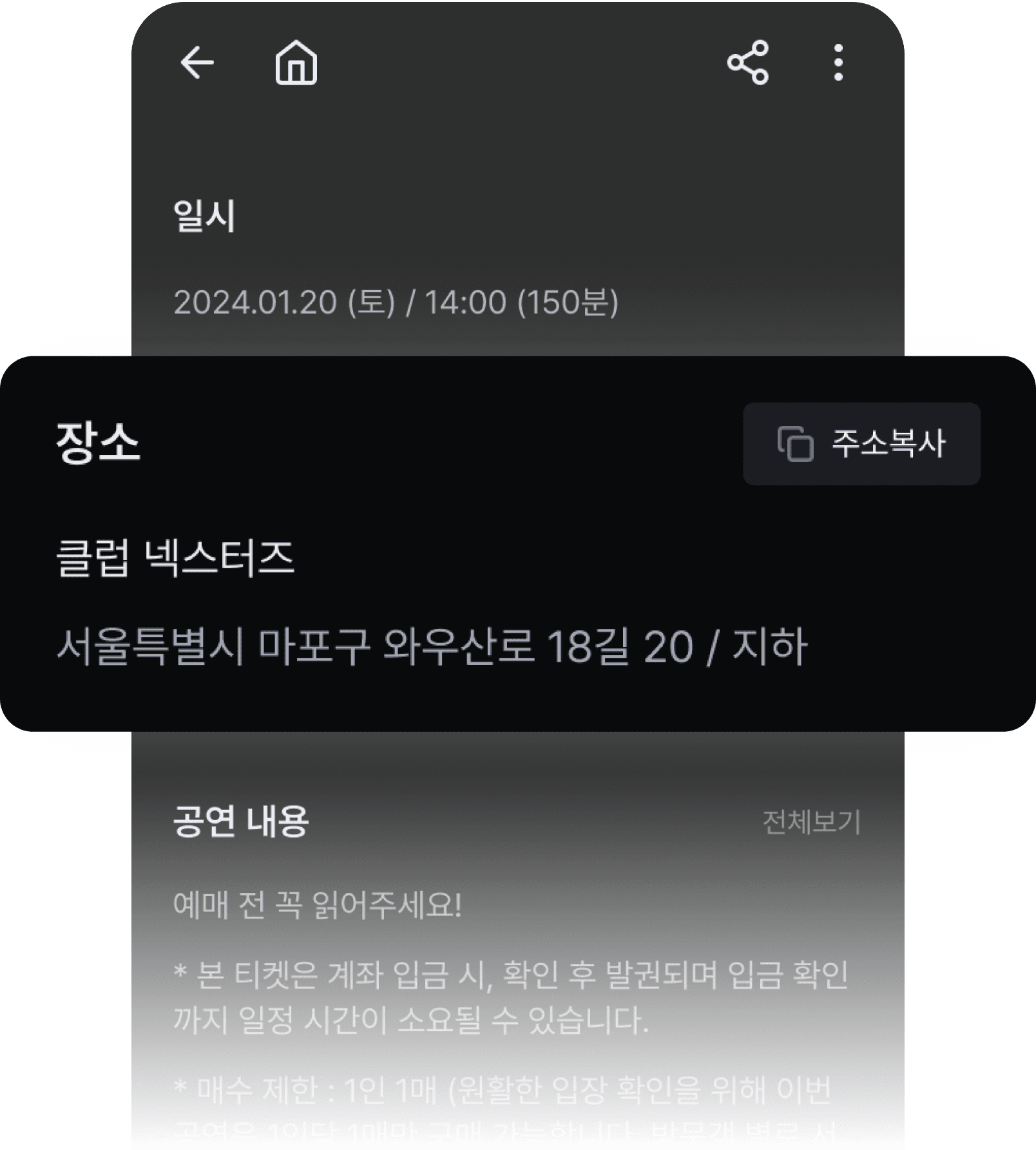 공연일, 공연장 위치, 안내 사항 등 방문할 공연의 정보를 한눈에 확인해요